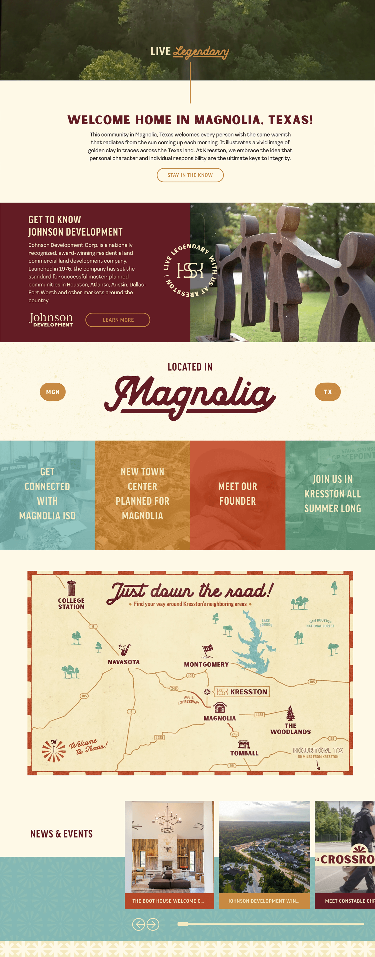 Kresston is a master-planned community located near Houston. This community falls under the iconic Johnson Development Communities umbrella, a respected and established development company with over 20 different master-planned communities to their name. Our job at ST8MNT was to start from the ground up - beginning with a brand workshop to uncover the brand direction, and spanning from naming, branding, copywriting, website design, signage, and much more.