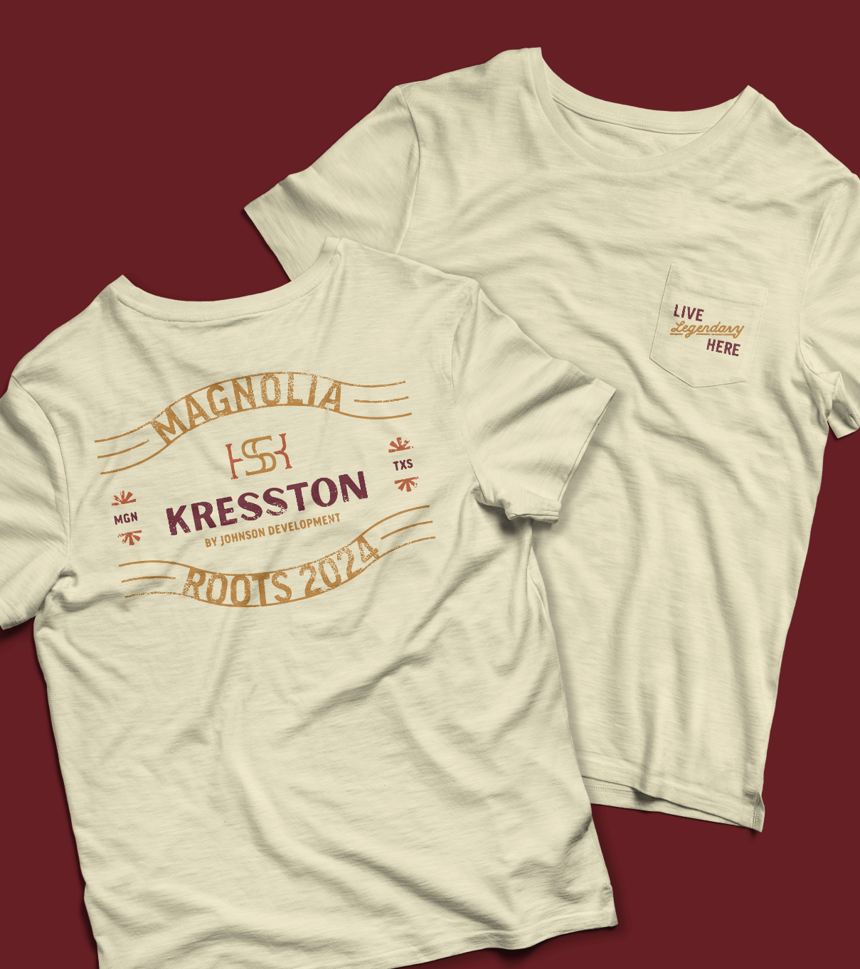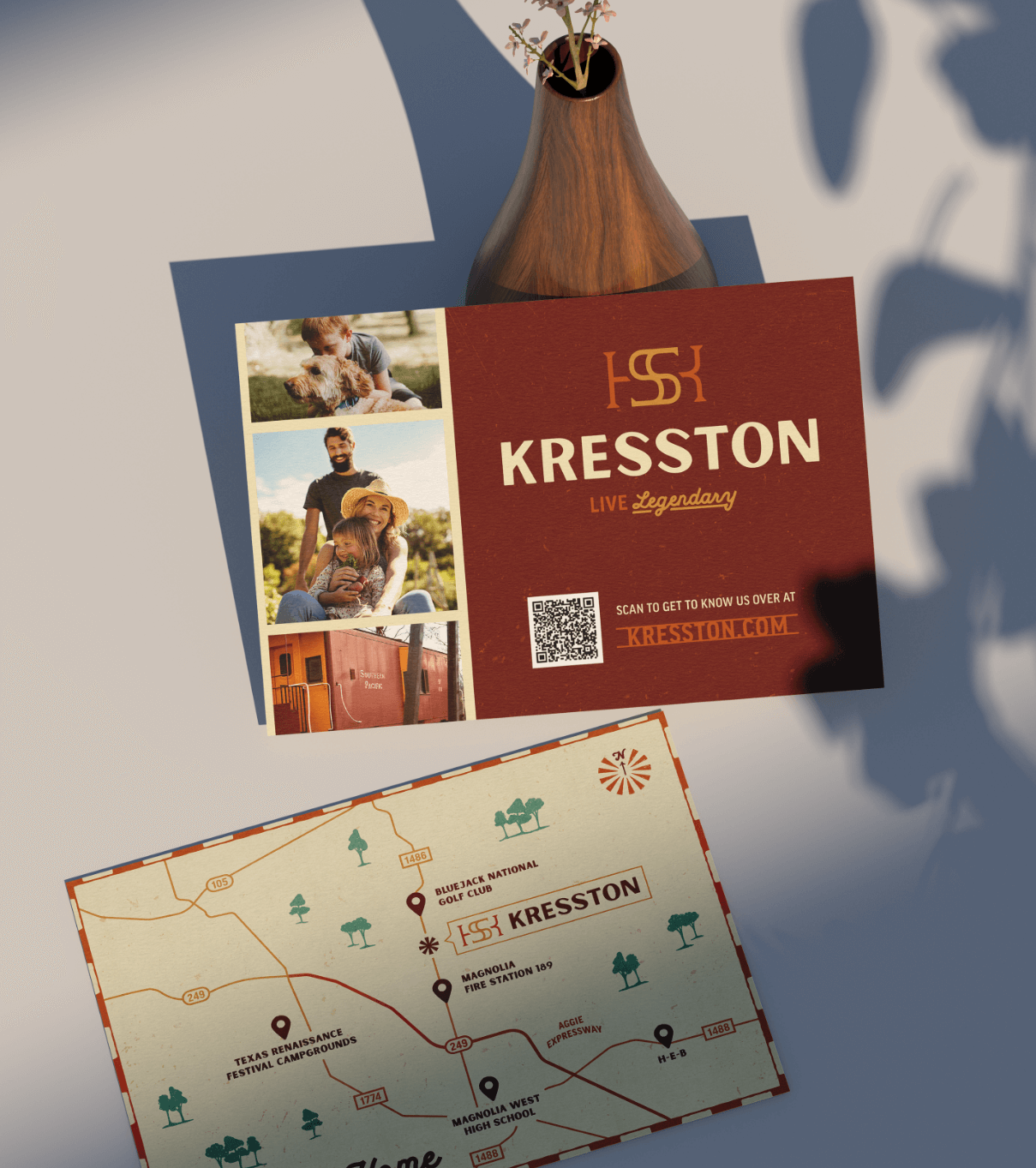 The brand we established for Kresston is unapologetically Texan, using authenticity and grit as its north star. In addition, this community has a large focus on nature and should never feel anything but welcoming. The monogram is inspired by a cattle brand, while the tagline “Live Legendary” gives folks a taste of the bold and warm attitude they can expect from this community.